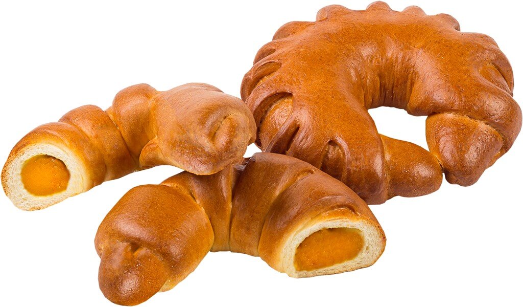 Форма рогалика. Начинка – повидло фруктовое абрикосовое. Упакованная.