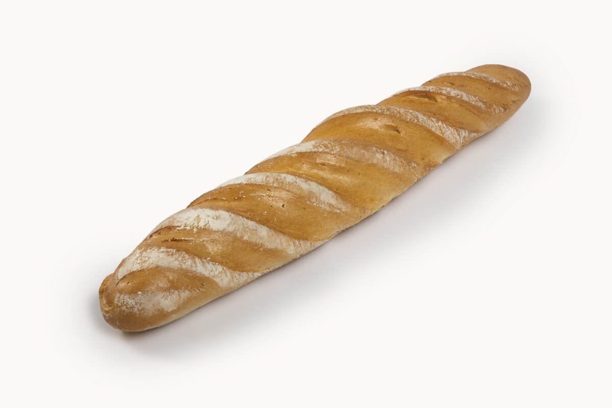 В форме багета с косыми надрезами. Поверхность присыпана ржаной мукой. Упакованный